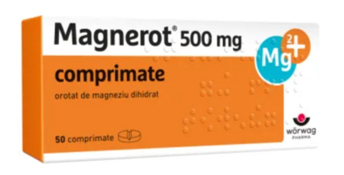 Useful information about Magnerot, 500 mg, 50 tablets, Worwag Pharma can be found in the articles: Anxiety, Arrhythmias (heart rhythm disorders), Atherosclerosis, Ischemic cardiopathy, Depression, Myocardial infarction, Asthenic syndrome, Burnout syndrome, Spring asthenia, Heart health. Magnerot 500 mg 50 tablets Worwag Pharma (Active component 500 mg Mg orotate 2H2O) belongs to the drug group: minerals, contains active ingredients: magnesium, and has indications in: muscle cramps (twitches), stress.